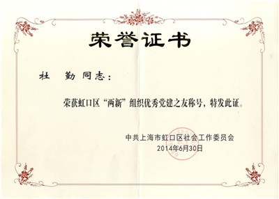 在中共虹口區委組織部和中共區社工委開展的評選表彰“優秀黨建之友”活動中,我公司總經理杜勤同志,榮獲虹口區“兩新”組織“優秀黨建之友”的光榮稱號。杜勤同志從我國社會主義建設在黨的領導... [查看更多]