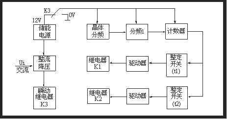 繼電器有晶體振蕩器、分頻器、整定開關(guān)、驅(qū)動(dòng)電路和電源回路等組成。當(dāng)繼電器施加額定電壓時(shí),繼電器內(nèi)部瞬動(dòng)繼電器和兩個(gè)延時(shí)繼電器瞬時(shí)動(dòng)作,觸點(diǎn)切換,并使電源回路與計(jì)時(shí)回路處于失電狀態(tài),以提高繼電器抗干擾性能。當(dāng)輸入電壓大大降低或完全消失時(shí),瞬動(dòng)繼電器瞬時(shí)返回(兩個(gè)延時(shí)執(zhí)行繼電器仍處于動(dòng)作狀態(tài)),觸點(diǎn)也瞬時(shí)返回,使儲(chǔ)能電源接通計(jì)時(shí)回路,晶體振蕩產(chǎn)生時(shí)鐘脈沖,經(jīng)分頻后得到10ms計(jì)時(shí)脈沖,計(jì)數(shù)器對(duì)計(jì)時(shí)脈沖計(jì)數(shù),當(dāng)所計(jì)脈沖數(shù)與整定開關(guān)值符合時(shí),驅(qū)動(dòng)執(zhí)行繼電器返回,完成斷電后延時(shí)返回的功能。原理圖如下圖所示